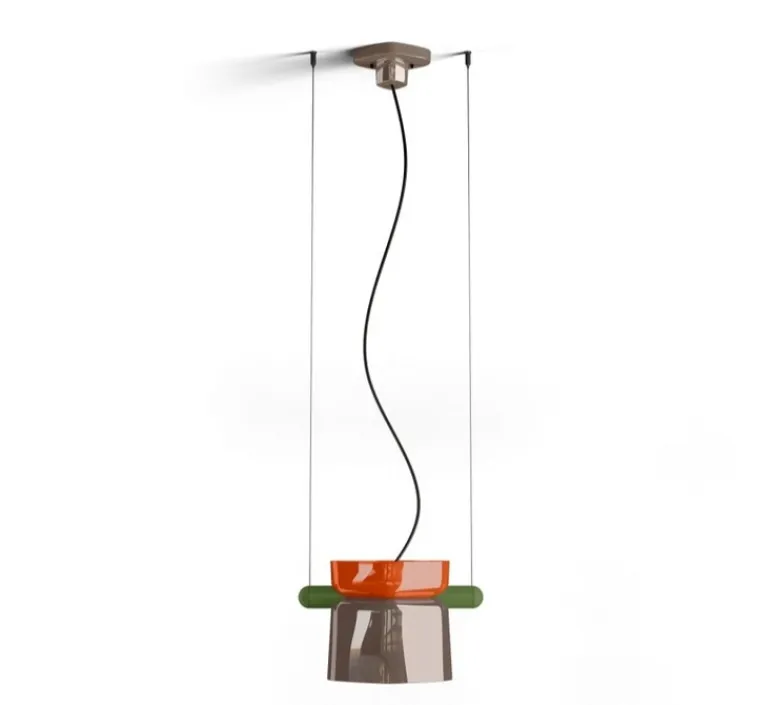 Avec ses formes géométriques rappelant les années 70 et ses nuances vives, elle apporte une touche ludique et vintage à n’importe quelle pièce. La structure en céramique, associée à des éléments de couleurs contrastées, crée un jeu visuel harmonieux tout en mettant en valeur le savoir-faire artisanal de Ferroluce. Cette suspension, audacieuse et élégante, incarne le mariage parfait du fonctionnel et de l’esthétique.