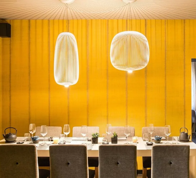 De nature sobre, le luminaire Spokes s’adapte à tout type d’espace (domestique et public) : un salon, une cuisine, un hall d’entrée, une chambre ou un bureau. Cette lampe aux formes sphériques et à l’allure légère dispose d’une source lumineuse LED 2700K 4080lm incluse ; elle permet d’obtenir des jeux d’ombres et lumières exceptionnels ; qui se projettent sur les parois de la suspension avec un effet de démultiplication.