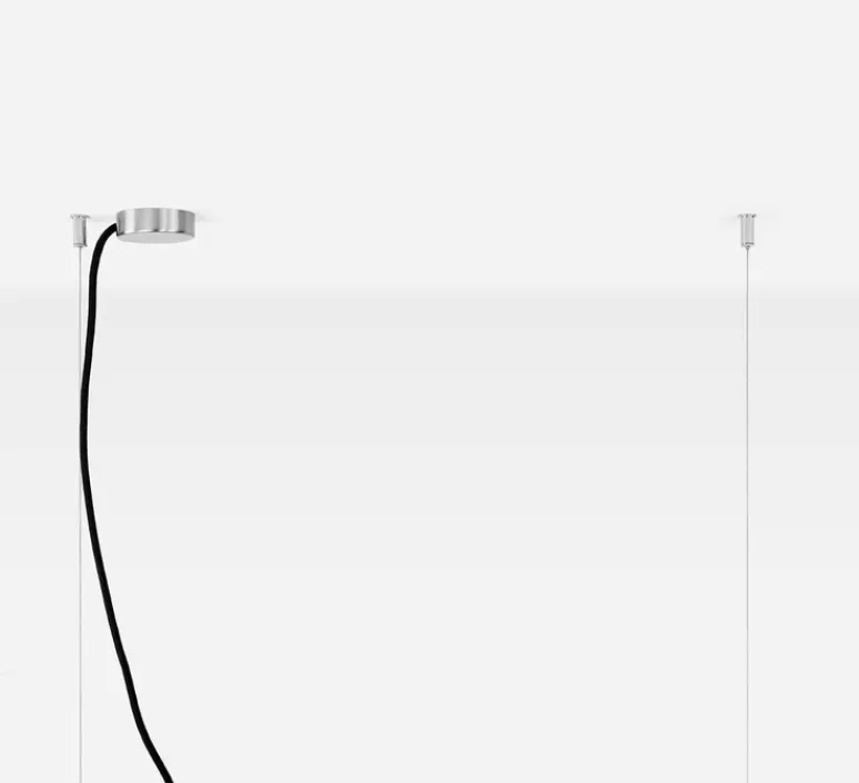 La suspension est vendue avec une rosace ronde en acier pour cacher la partie électrique de l’ensemble; et le système de fixation des 2 câbles d’acier n’inclut pas d’accroches spécifiques afin que la suspension puisse être suspendue sur n’importe quel type de surface, en fonction de votre plafond (bois, béton,..).