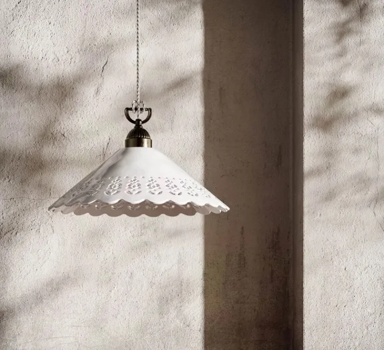 Classique et minimaliste, c’est dans les détails que se révèle l’élégance de la suspension Fior Di Pizzo 08. Elle se compose d’un abat-jour en céramique ajouré au motif floral, suspendu par un câble blanc rattaché au 2 extrémités par une attache en laiton brut. Les ouvertures sur l’abat-jour s’inspirent de la broderie pour lui donner l’aspect de la dentelle. Elles permettent aussi de projeter des ombres de fleurs aux alentours lorsque la suspension est éclairée.