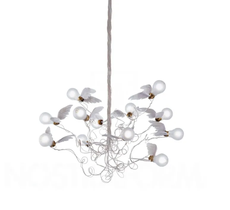 Habillée de plumes d’oie accrochées délicatement à douze ampoules LED, elle peut être disposer à vos souhaits grâce à ses fils en fer pour un semblant de vols d’oiseaux .