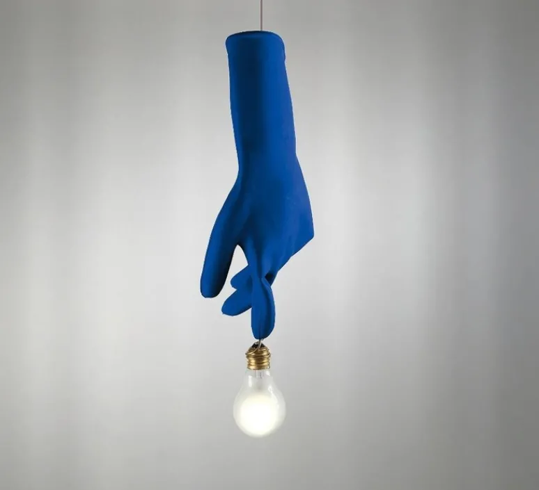 Étonnante et sculpturale, cette suspension met en scène un gant en caoutchouc bleu, peint à la main, dont l’index illuminé par une ampoule E27 (130 lumens) semble pointer vers l’imaginaire. Son éclairage blanc chaud de 2700 K sublime les espaces avec une lumière à la fois douce et enveloppante.