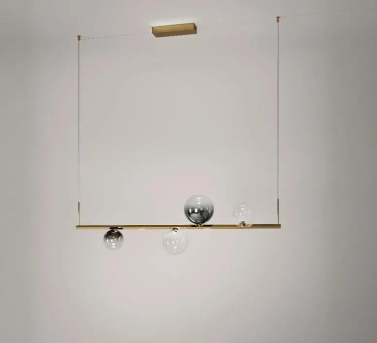 Dessiné par le designer Chia-Ying Lee, ce luminaire fait partie des dernières créations de 2024. Son design asymétrique se distingue par une structure tubulaire dorée et quatre diffuseurs sphériques. Sa finition en gris fumé, cristal et chrome souligne l’aspect épuré de cette création tout en offrant une touche raffinée.