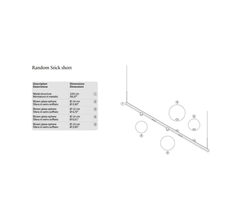 D’une grande flexibilité décorative, la suspension Random Stick Short se distingue par ses dimensions de 100 cm de long et 2 cm de diamètre. A travers la disposition des diffuseurs sphériques de tailles variées (de 10 à 14 cm), la créatrice présente un luminaire au design subtile et poétique rappelant de fragiles bulles de savons prêtes à s’envoler dans les airs.