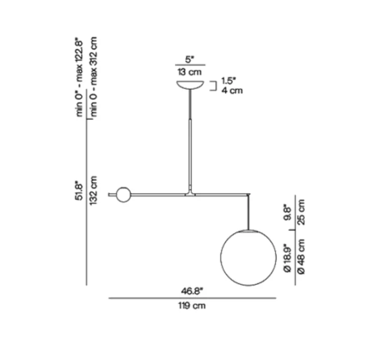 Elle mesure 132 cm de hauteur, 119 cm de longueur et 48 cm de profondeur. Le diffuseur opalin a un diamètre de 48 cm. L’ampoule LED dimmable E27 d’une puissance maximale de 8W n’est pas fournie mais est recommandée pour le bon fonctionnement du luminaire.