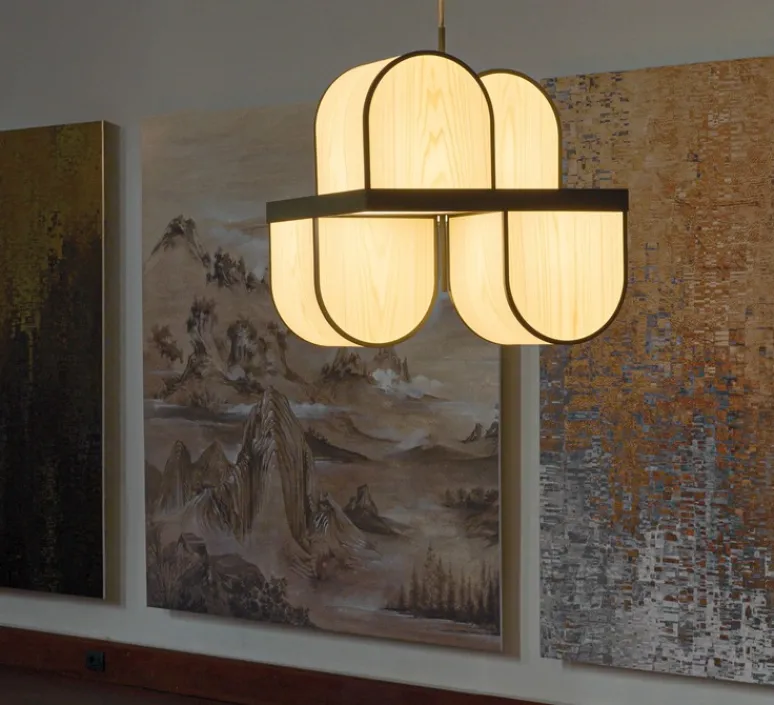 Composée d’arcs en feuilles de bois qui se croisent harmonieusement, Osca crée une forme sculpturale unique. Sa structure asymétrique se dirige à la fois vers le haut et vers le bas, apportant une profondeur visuelle à l’ensemble. Cette suspension joue sur l’interaction entre les formes géométriques et la lumière, révélant la beauté naturelle du bois dans une composition sobre mais percutante.