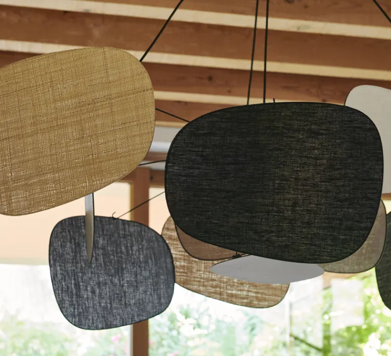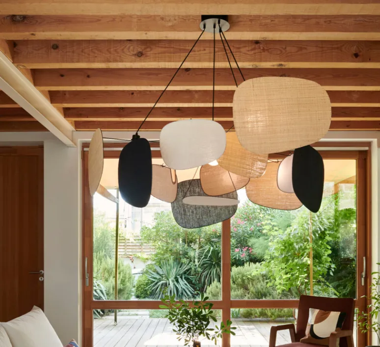 Voici la suspension 4 lumières XXL finitions lin bouleau, raphia et lin noir doublée de la collection Screen 70’s proposée par la maison Market Set !