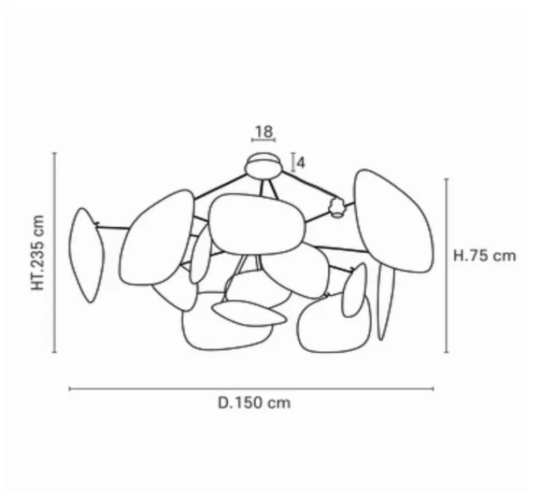 Ce lustre comprend une structure en métal peint ainsi que 13 écrans en lin.