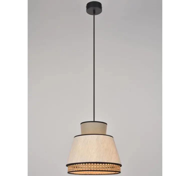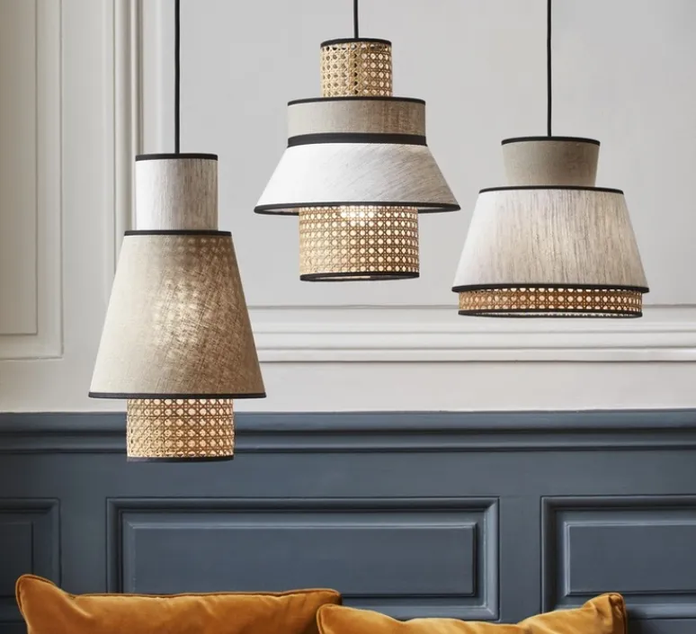 La suspension est composée d’un empilement de 3 abat-jour en lin lavé et cannage. Elle est équipée d’un cordon textile et d’un pavillon en métal adaptable DCL.