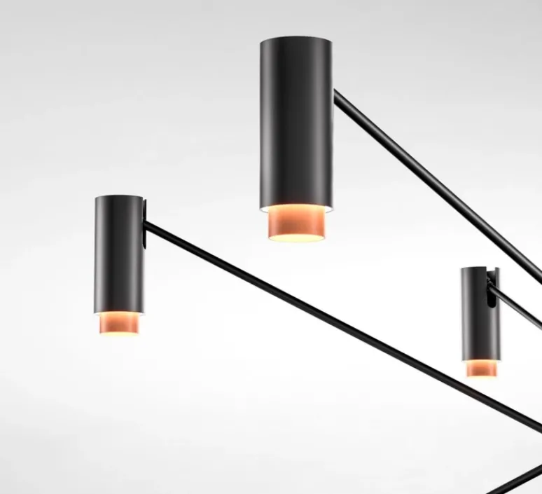 Inspirée des anciens bobinoirs à fils, elle se compose d’une structure tubulaire centrale à laquelle sont reliées plusieurs tiges amovibles. Certaines peuvent être orientées vers le haut et d’autres vers le bas pour finir par donner à l’ensemble une forme de losange. Chaque tige se termine par un petit projecteur avec un anneau terracotta.