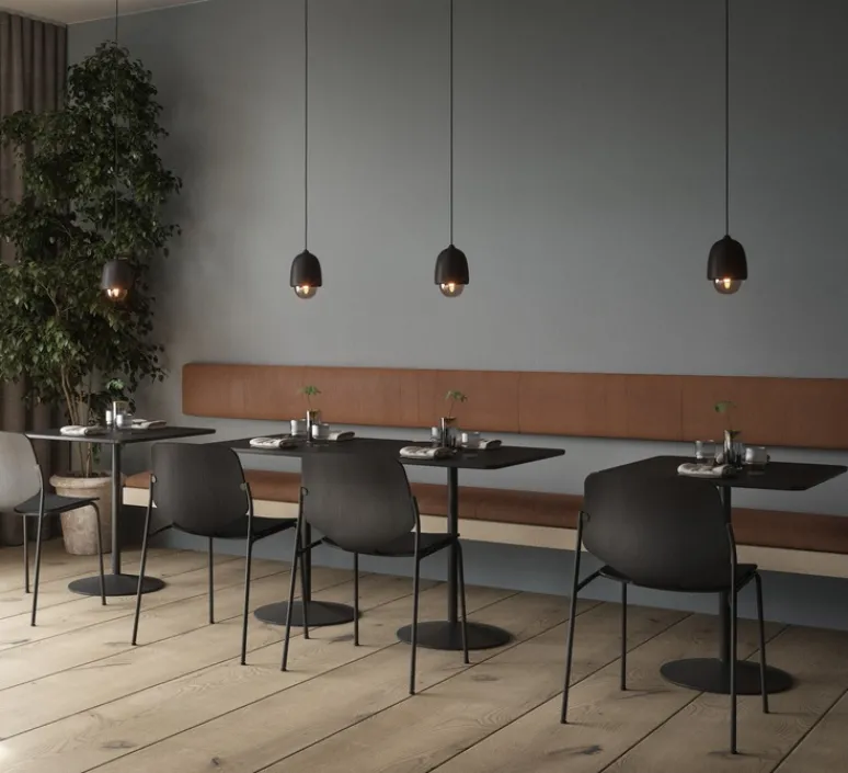 Au-dessus d’un plan de travail ou d’une table de salle à manger, la suspension Terho aime se présenter à plusieurs, à hauteurs différentes, dans ses trois tailles et deux finitions de bois.