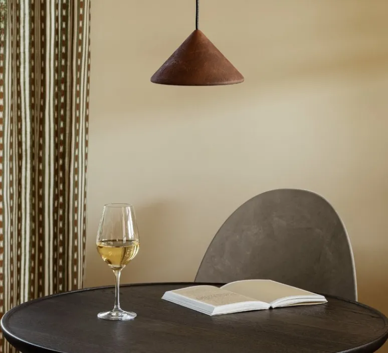 Avec ses lignes coniques épurées et sa finition rouille intense texturée, Terra incarne une esthétique brute et contemporaine. Le matériau Matek™ confère à l’objet une dimension tactile originale, tout en permettant une intégration discrète des éléments techniques. À suspendre seule au-dessus d’une table ou en série dans une cuisine ou un couloir, elle s’intègre