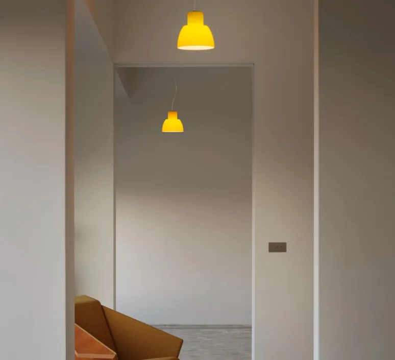 La suspension jaune Sorrento Lorosae de la collection du même nom est une création d’Álvaro Siza rééditée pour la marque italienne Nemo Lighting.