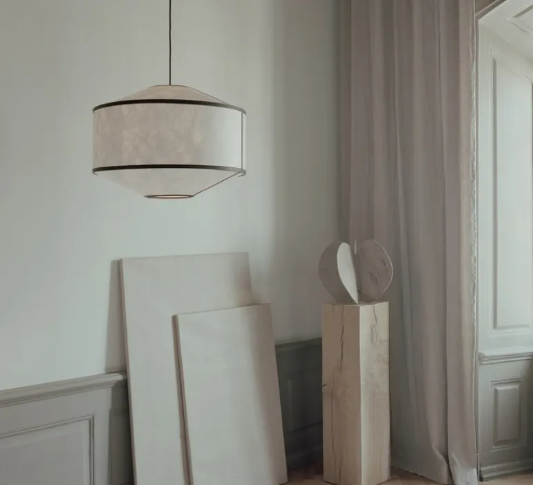 La suspension Kite 2B est une œuvre d’art en soi, mariant des silhouettes géométriques pures et avec une matérialité lisse et texturée grâce au Tyvek. Ses couleurs blanc et noir créent un contraste élégant, tandis que ses rubans adhésifs délicats dessinent les contours des formes, ajoutant une dimension de profondeur. Que ce soit présentée seule ou en combinaison avec d’autres lampes de la collection, la Kite devient un élément sculptural qui attire tous les regards.