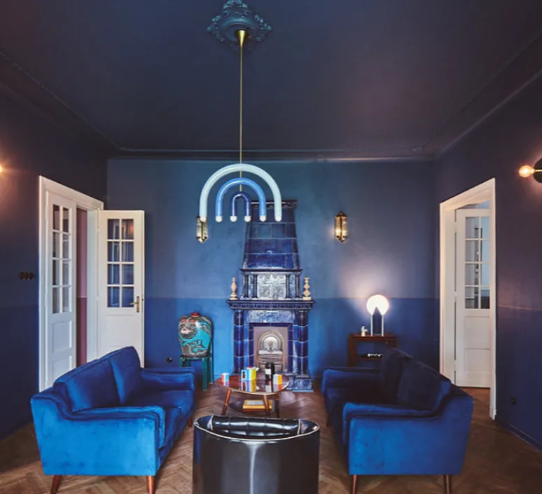 Le modèle F1 associe une forme cylindrique verticale à des nuances de bleu profond et nuancé. Sa présence graphique permet de structurer visuellement un espace, seul ou en composition avec d’autres pièces de la collection. Installée dans un salon, un hall ou un espace ouvert, elle introduit une touche de couleur minérale et de matière brute.