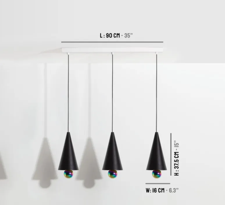Les 3 suspensions Cherry sont composées de 3 petites suspensions mesurant chacune 37,5cm de hauteur et ⌀16cm. Le système de suspension linéaire est inclus. Le câble noir de 3m est inclus. Les 3 ampoules LED sont intégrées et possèdent chacune une puissance de 7,8W, 3000K et 1040lm. Driver non requis. Dimmable.