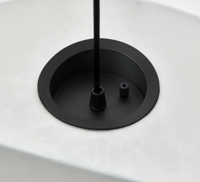 La suspension Turner 50 a un diamètre de 50cm. La source lumineuse n’est pas fournie, on recommande une ampoule E27 max 15W. La rosace a un diamètre de 12cm pour une hauteur de 8cm et le câble noir en pvc mesure 3m.