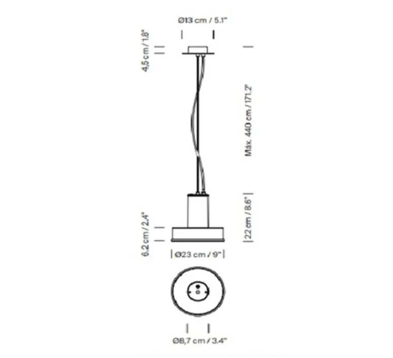 La suspension mesure 23cm de diamètre et 22cm de hauteur. La source lumineuse 2700K, 2471lm est incluse.