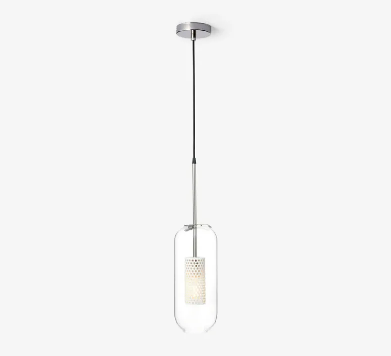 Aux lignes épurées, Vadim arbore une tige d’acier chrome sur laquelle est suspendue l’ampoule, sertie d’une cage perforée qui laisse transpercer la lumière. Le bulbe en verre généreux contraste avec la finesse de sa tige en acier et lui confère élégance et intemporalité.