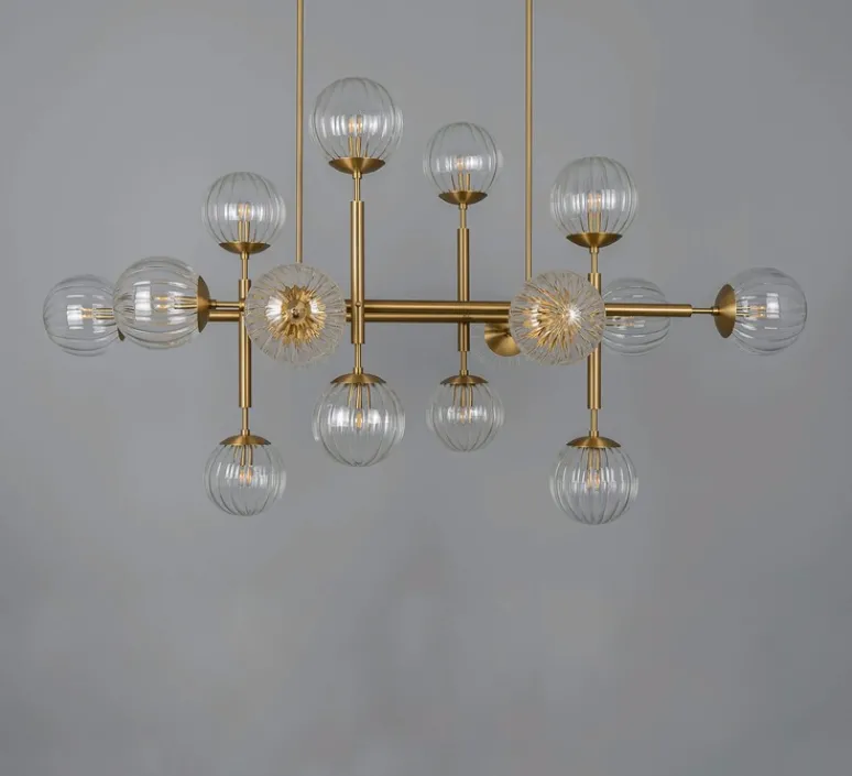 Ce lustre se compose de globes de verre sophistiqués autour d’une tige en laiton. La structure enchanteresse des orbes soufflés à la bouche crée une forme changeante qui change à chaque vue.
