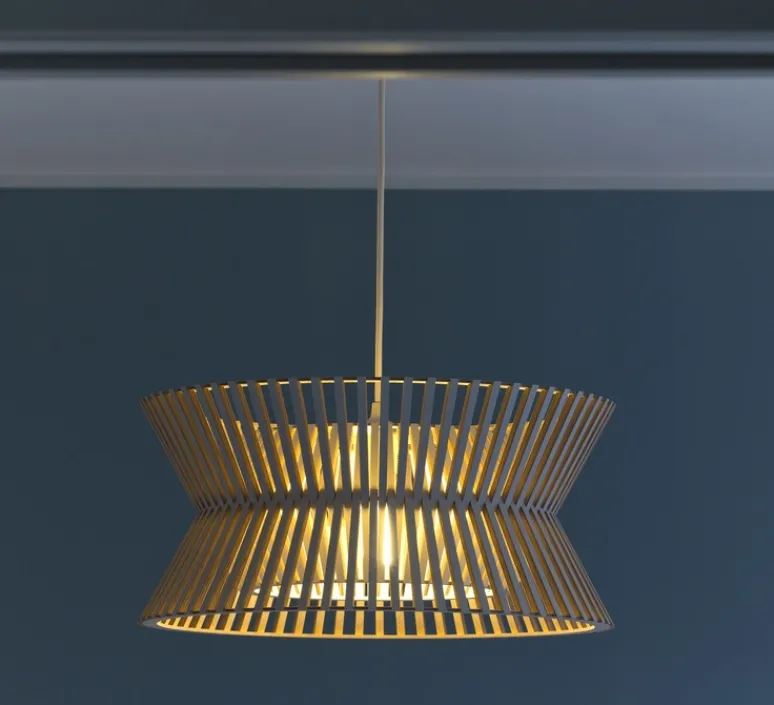 L’abat-jour exceptionnel de la lampe à suspension est en bouleau pressé certifié PEFC. Pour Secto Design, des experts ont produit cette silhouette en X unique à la main. Les nuances sont faites de lamelles de bouleau stratifiées reliées par des anneaux de contreplaqué d’avion.