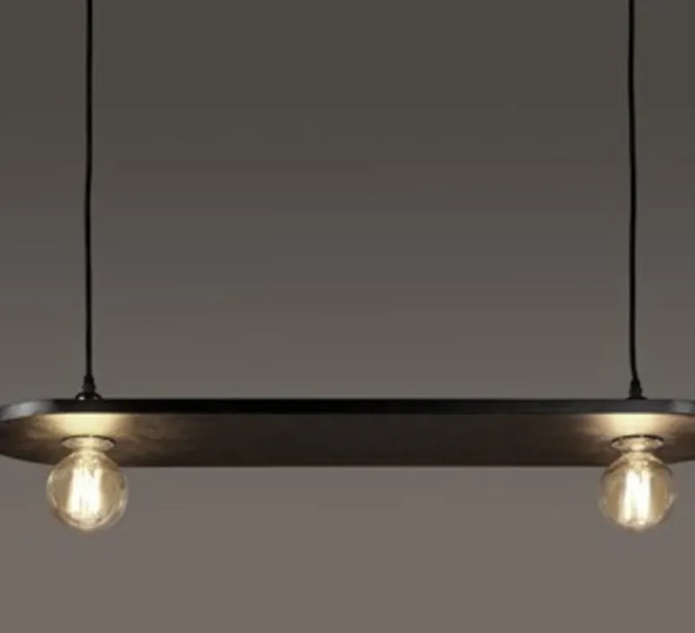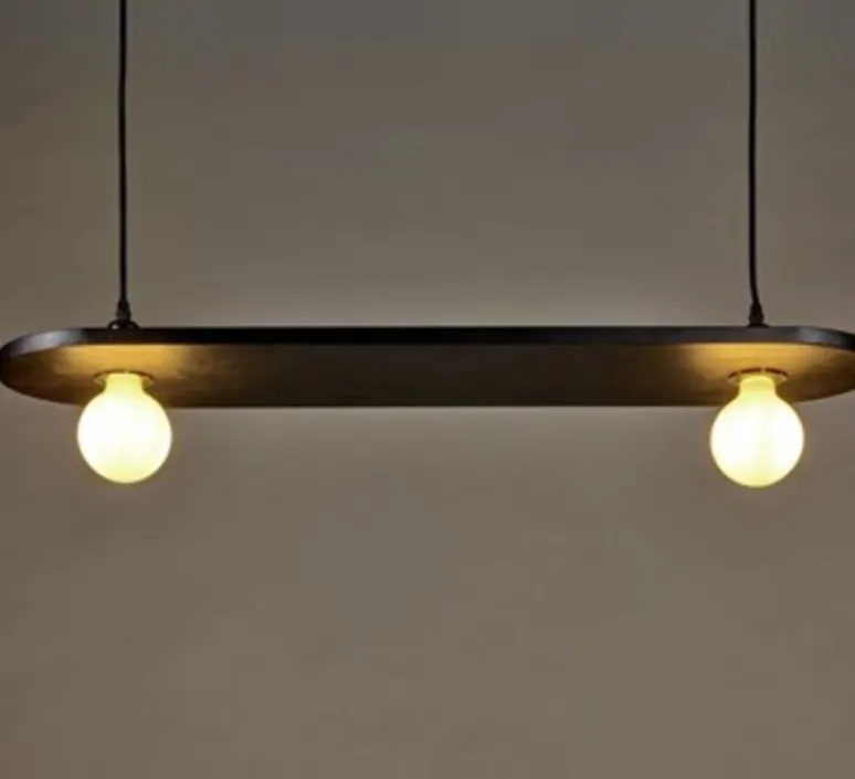 Très élégante, cette suspension se compose d’une simple plaque en bois noir aux angles arrondis. De plus deux câbles en acier gainé, sont fixés, rejoignant des socles qui peuvent être allongés ou raccourcis en fonction de vos préférences.