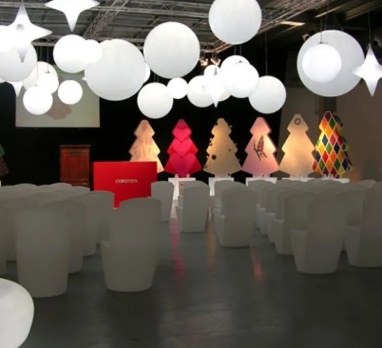 Cette collection se décline aussi pour l’intérieur, en lampe à poser et lampadaire et en de nombreux diamètres. Idéal pour les beaux plafonds hauts et pour les événements.