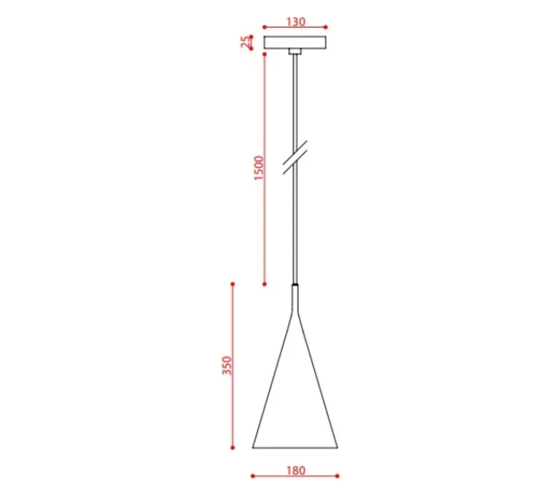 Le diamètre de l’abat-jour est de 18 cm et 35 cm de hauteur. La suspension est reliée à la rosace par un cable noir de 1,5 m.