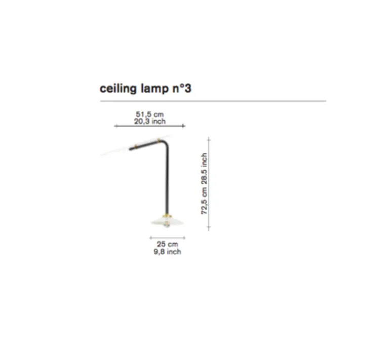 Le design de cette lampe est d’une simplicité presque naïve, et pourtant, les lignes qui la compose remplissent l’espace de manière ludique et colorée. Le plafonnier n°3 est composé d’un tube en acier noir courbé et d’un abat-jour blanc qui, selon Hannes Van Severen, « a une forme fantastique : parfaitement neutre ».