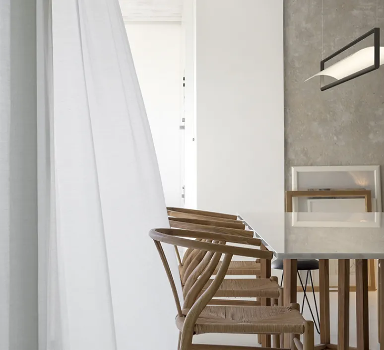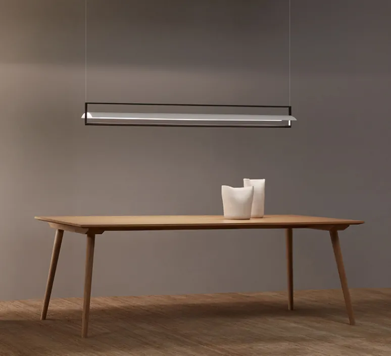La suspension Kontour se présente sous la forme d’un cadre métallique rectangulaire ouvert équipé de LEDs, accueillant, en son centre, une plaque de métal incurvée faisant office de réflecteur. Suspendue à de fins câbles presque invisibles, elle apporte un éclairage diffus évoquant une pluie de lumière. Offrant littéralement un cadre à l’éclairage, la suspension Kontur met élégamment en scène la source de lumière, qui apparait ici sous la forme d’une ligne lumineuse. Mariant ainsi pureté des volumes et architecture géométrique graphique, la suspension Kontur s’intègre aisément dans les lieux privés ou publics, que ce soit au-dessous d’une table, dans une pièce de vie ou un espace de travail.