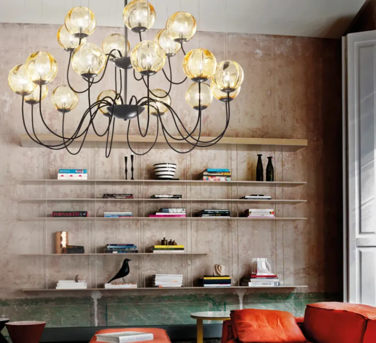 Le verre ambre transparent, strié de façon irrégulière, capte la lumière et crée des effets visuels changeants selon l’angle de vue. Puppet SP 18 devient un point focal idéal dans un espace de vie, une salle à manger ou un hall d’entrée à grande hauteur sous plafond. Les câbles en acier permettent de jouer avec les volumes en suspendant les diffuseurs à des niveaux différents, pour une composition sur mesure.