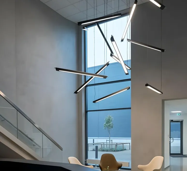 La suspension Trapets propose un éclairage direct non dimmable LED de 3000K et de 2115 lm. Son éclairage crée une ambiance chaleureuse et lumineuse, idéale pour les bureaux, les ateliers ou les grands espaces.