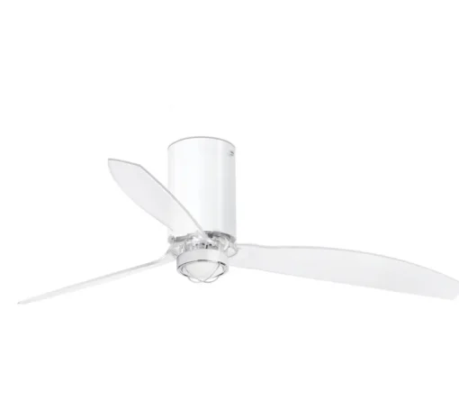 La fixation du ventilateur au plafond est sur rotule. Le ventilateur Mini Tube mesure Ø128cm de diamètre, 32,4cm de hauteur et pèse 5.60kg. La source lumineuse n’est pas incluse (SMD LED 17W 3000K 600Lm).