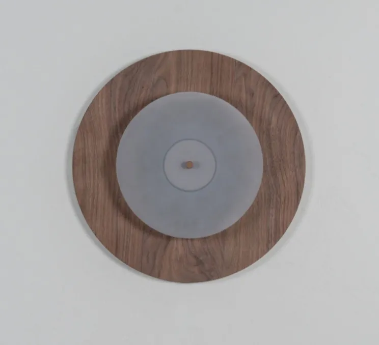 Sa conception minimaliste se dessine à travers trois cercles distincts, divisés par une ligne verticale, où le cercle supérieur en bois se soutient élégamment par deux éléments en verre sablé. La fins tige d’aluminium souligne avec précision la géométrie raffinée de cette applique, ajoutant une touche artistique à tout espace.