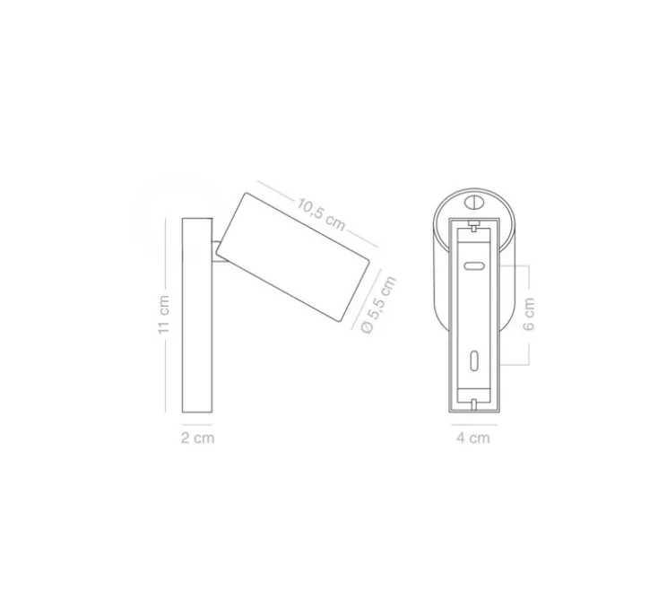 Sur la plaque de montage rectangulaire se trouve un cylindre que vous pouvez incliner de haut en bas et orienter de gauche à droite. Cela vous permet de diriger parfaitement la lumière là où vous la souhaitez. La lampe est équipée d’un interrupteur, ce qui en fait une lampe de chevet idéale.
