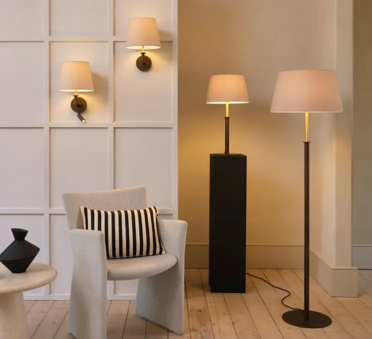 Ce luminaire mural mêle subtilement métal bronze, laiton naturel et textile blanc, pour une solution d’éclairage élégante et fonctionnelle, idéale pour l’hôtellerie haut de gamme.