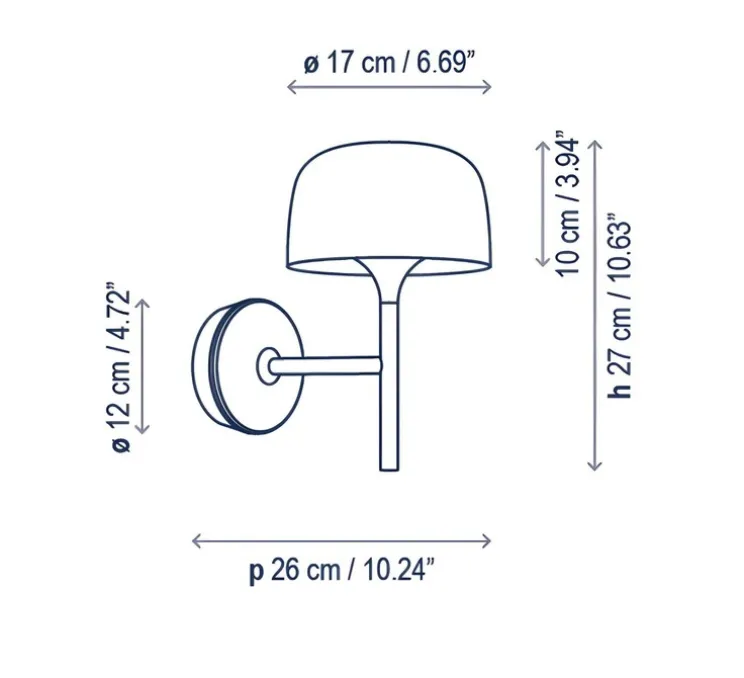 Bol A/01 est équipée d’une source LED intégrée de 8,4W, offrant une température de couleur de 2700K et un flux lumineux de 1200 lumens. Fabriquée en aluminium, elle mesure 26 cm de profondeur, 27 cm de hauteur, avec un abat-jour de 17 cm de diamètre et une base murale de 12 cm de diamètre.