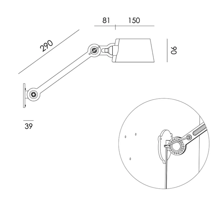 Le luminaire Bolt est composé d’une base murale avec câble et branchement mural, d’un bras et d’un abat-jour circulaire rotatif. Fonctionnelle et versatile, l’applique Bolt s’installe dans chaque espace intérieur, que ce soit dans une chambre, un bureau ou une pièce de vie.