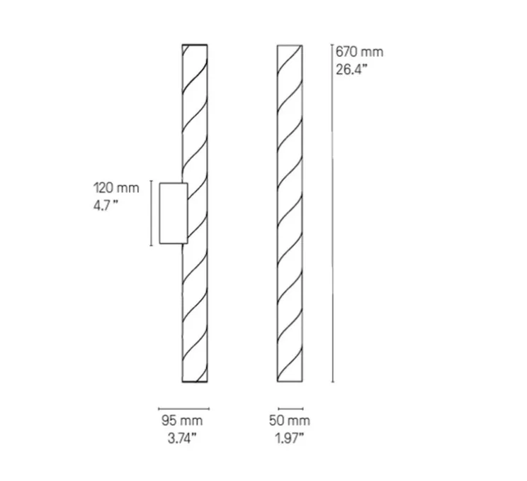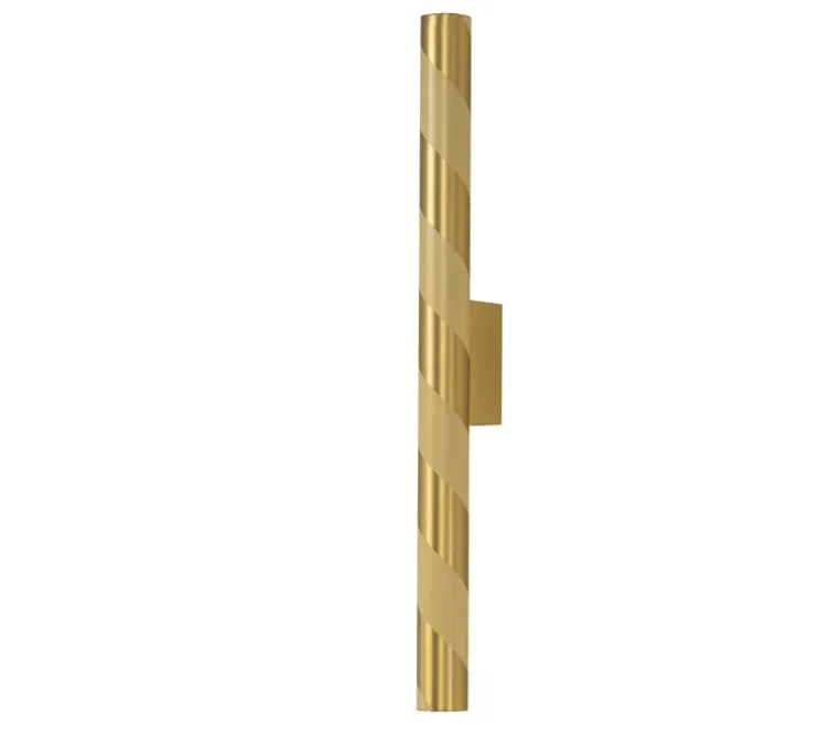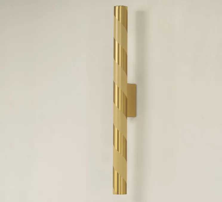L’applique se compose d’un tube en laiton finition laiton satiné, parcouru d’un motif laqué en spirale qui rappelle les cannes de sucre d’orge. Cette touche visuelle, ludique et colorée, dialogue avec l’univers de l’enfance tout en contrastant avec la sobriété du métal. Fine et verticale, cette applique s’intègre dans un couloir, une chambre ou un salon, seule ou en répétition, pour créer un rythme graphique sur le mur.