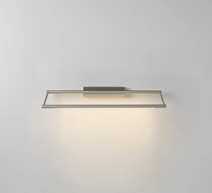 L’applique en laiton massif est composée d’une base en laiton à laquelle est rattaché un rectangle lumineux. Cette applique dispose d’une finition en nickel satiné.