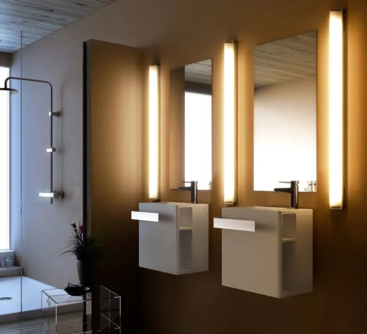 Avec ses lignes longilignes et son duo de finitions blanc et chrome, cette applique habille le mur avec sobriété. Sa silhouette apporte de la hauteur et structure l’espace. Elle trouve sa place dans une salle de bain ou un couloir, seule ou en duo de part et d’autre d’un miroir.