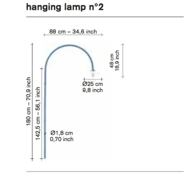 Disponible dans différents modèles en bleu, jaune curry, vert, gris, noir ou en laiton sur demande. L’applique mesure 180cm de haut sur 88cm de long. La partie fixée au mur est de 142,5cm. Le diamètre de l’abat-jour est de 25cm. L’ampoule E27 n’est pas fournie. La longueur du câble est de 5m.