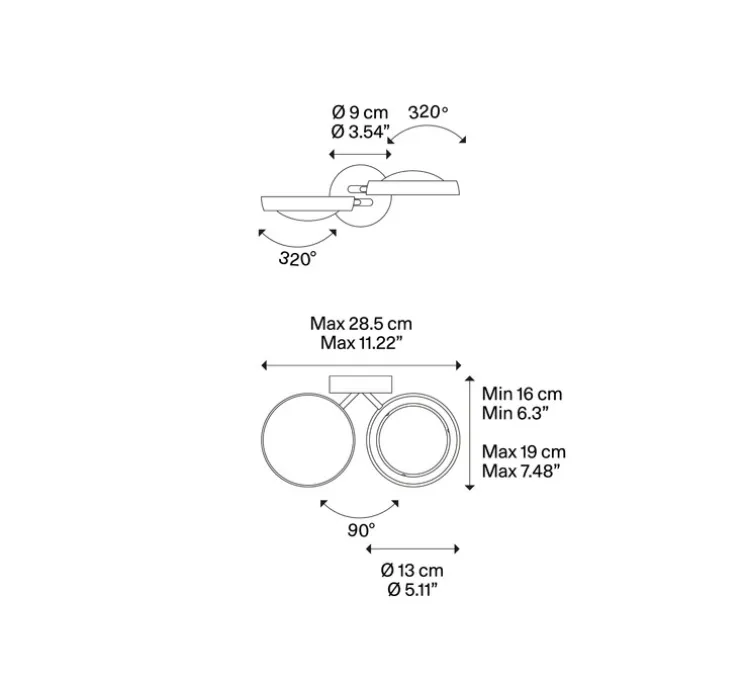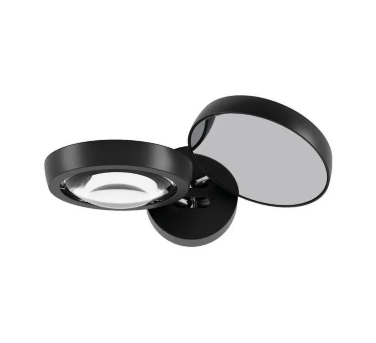 Son design composé de deux diffuseurs circulaires en métal se distingue par sa fonction orientable, qui permet une diffusion lumineuse maîtrisée, à la fois directe et indirecte. Chaque tête pivote à 90° et s’oriente à 320°, offrant une grande liberté dans l’éclairage.