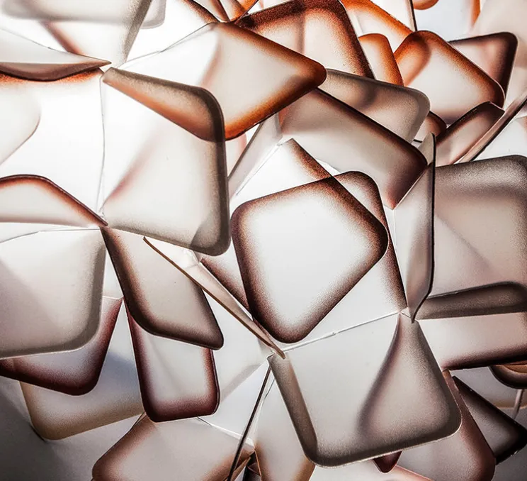 Clizia L orange reprend les formes de la nature : c’est un nuage qui capture la lumière du soleil aux premières heures du jour et qui se charge de reflets chatoyants, c’est la cime d’un arbre à travers laquelle filtre la lune en créant des jeux d’ombres. Clizia donne à votre environnement la lueur romantique des premières heures de l’aube. Avec sa forme peu commune Clizia s’intègre dans une chambre, un salon ou un bureau.