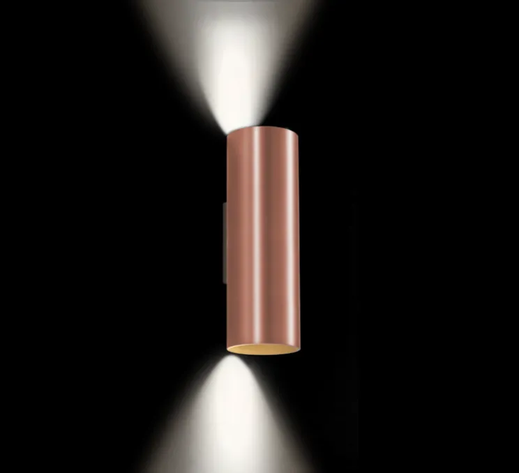 Les dimensions de l’applique murale sont de 20 cm de hauteur et 6,7 cm de diamètre. Disponible en différents coloris (noir, blanc, cuivre et aluminium brossé) et en différentes tailles avec ou sans le système LED.