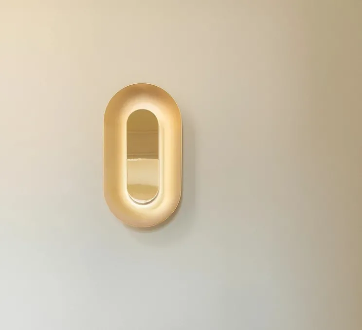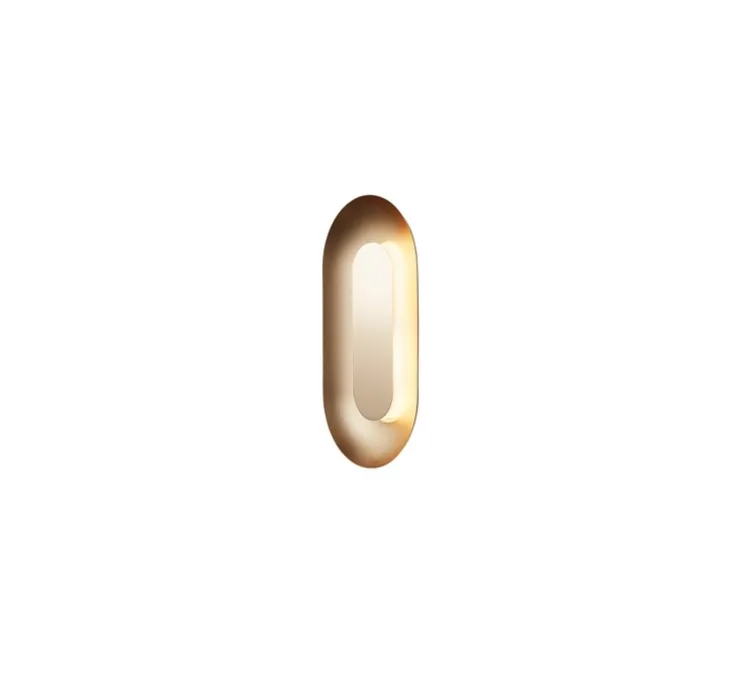 Sasi Small est une petite applique design créée en collaboration avec le néerlandais Rick Tegelaar. Un abat-jour oval en aluminium doré et en laiton brossé constitue la base, et une forme plus petite en laiton poli est placée au centre.