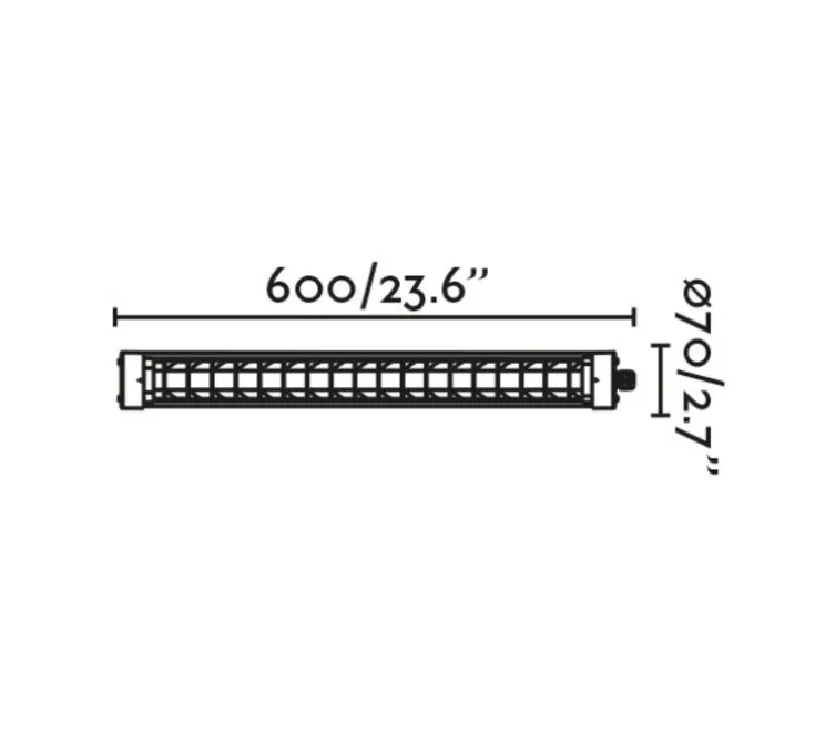Scuba Louver 600 mesure 60cm de long et a un diamètre de 7cm. Sa source lumineuse est incluse : LED 20W, 2700K, 1280 Lumen. Le modèle existe en deux tailles différentes.