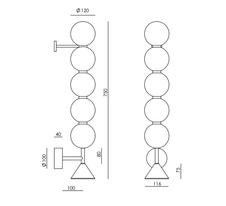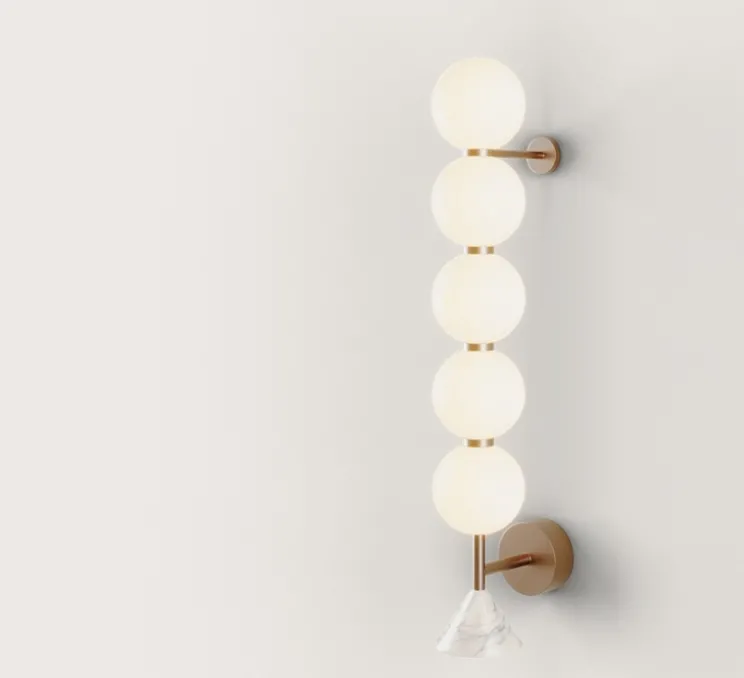 Cette applique mesure 75 cm de hauteur et dispose de 5 globes opalin en verre faisant 12 cm de diamètre. Sa source lumineuse est incluse et offre une puissance lumineuse totale de 1 500 lumens en 2700 kelvins, pour une lumière chaude et agréable.
