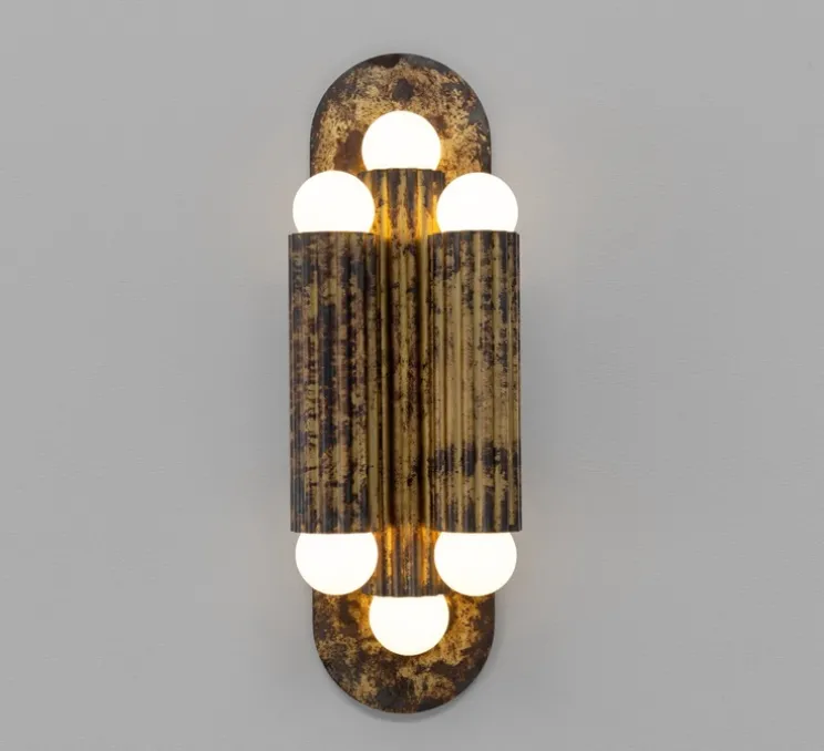 Elle se compose de trois cylindres superposés en laiton travaillé, chacun orné de chaque côté d’un globe en verre, reposant élégamment sur une base murale. Sa silhouette évoque à la fois la verticalité rythmée des cannelures grecques et la fluidité des drapés antiques, transformant le métal en mouvement et la lumière en poésie. Inspirée par Vesta, déesse romaine du foyer, cette applique incarne chaleur, protection et grâce intemporelle, tout en révélant le savoir-faire artisanal de Schwung à travers ses finitions patinées uniques.