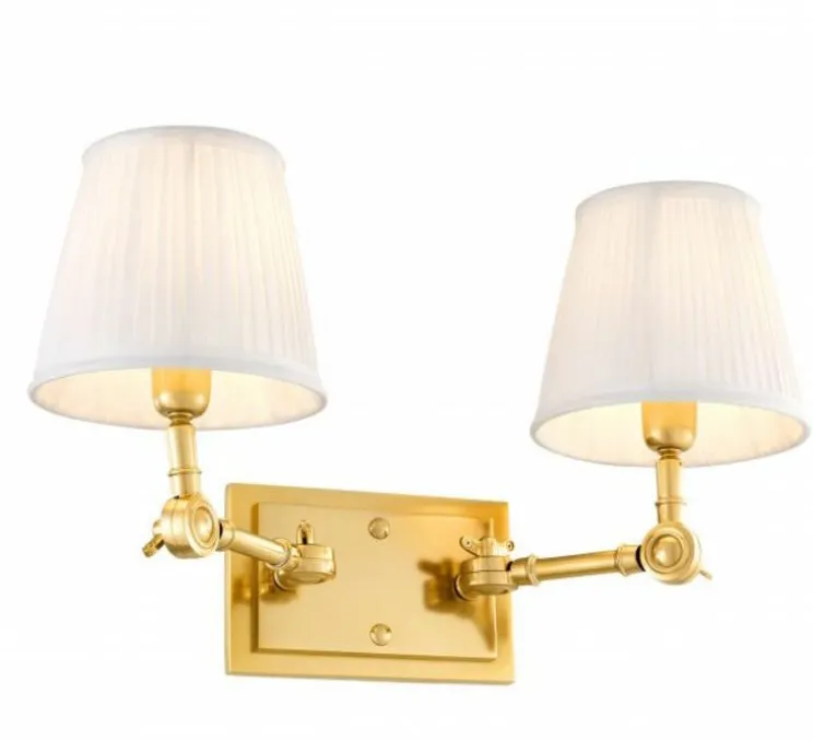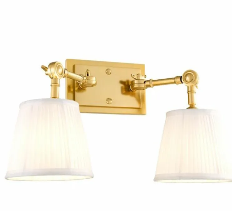 Inspiré des appliques classiques de style ancien, ce luminaire mural en laiton vintage est équipé de deux bras articulés réglables et de deux abat-jour blancs plissés.